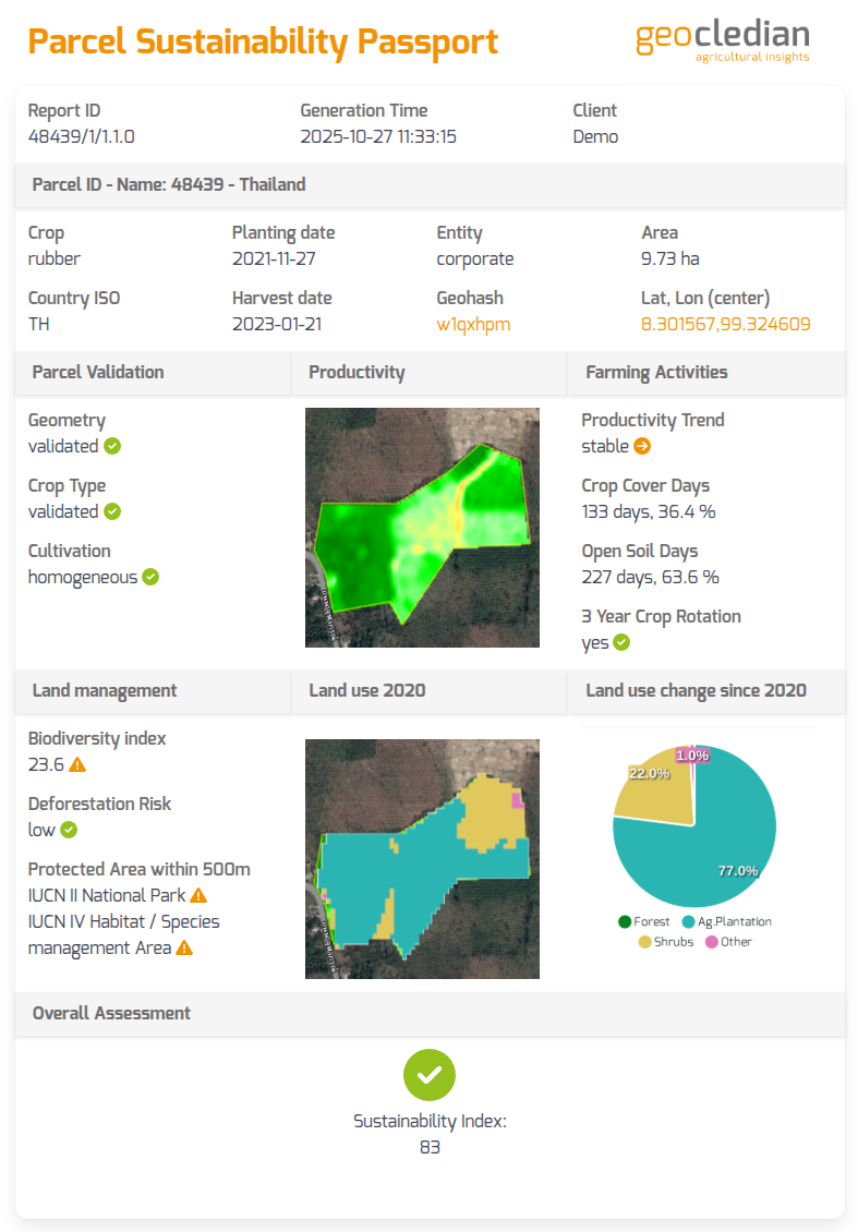 - Issue a comprehensive Parcel Sustainability Passport covering critical climate resilient farming practices, historic cultivation analysis and cover additional environmental risks